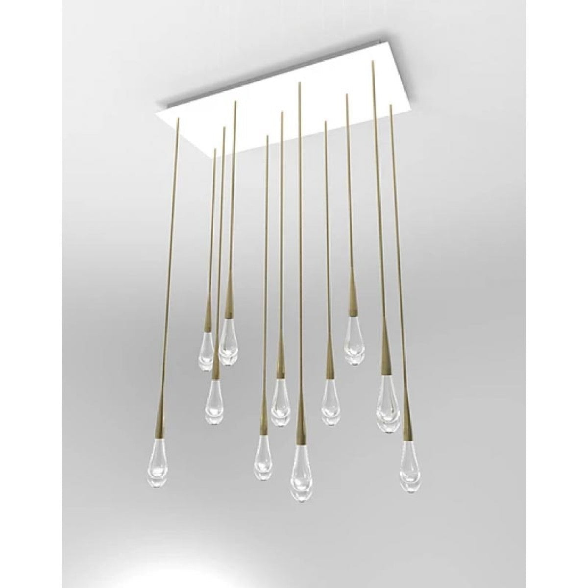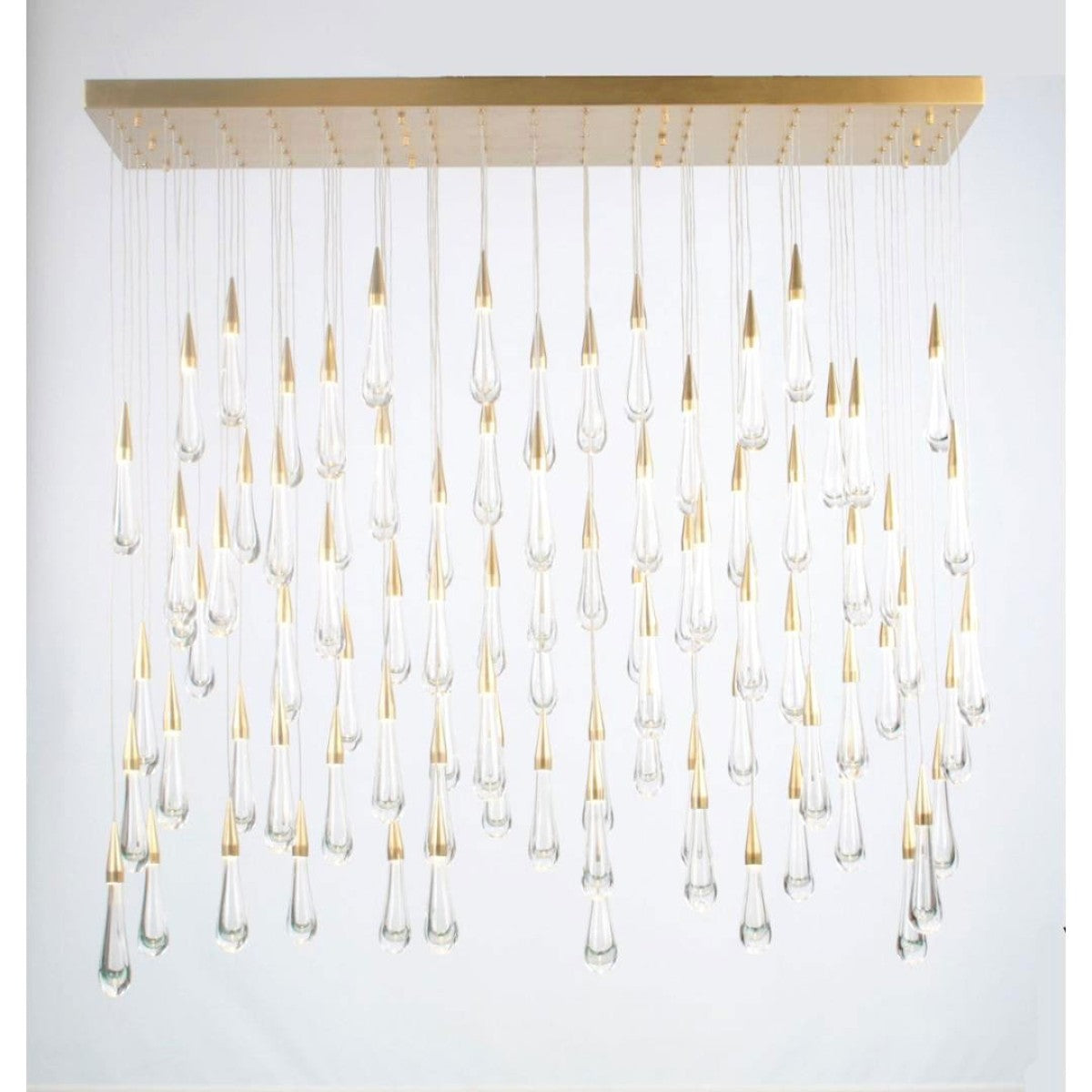 The light installation is a teardrop-shaped chandelier with deliciously unique lights that celebrate the fascinating nature of raindrops, where no drop is the same as the next. Each drop is hand blown by artisans and intricately engineered to house the lighting strategy for the chandelier. When you see a light sculpture designed to increase the visual appeal of a room and define its luminous character, you stop on your way to admire it. It’s the case of the Raindrop chandelier known as “The Pour”, a modern light sculpture meant to illuminate and beautify its chosen location to create an architectural relationship with the space. The drop itself is constructed of two parts: the brass screw cap, which houses the light, and the hand-blown crystal reflecting the light to create puddles on the floor below. To replicate the nature of raindrops, no two drops are blown identical. The name “The Pour” derives from the distinctive shape that the chandelier forms: an exaggeration of the dramatic motion of water pouring out of a carafe. Designed by forming a grid mimicking how puddles ripple outward in concentric circles, each teardrop is hung to brass pipes of varying lengths. Placed strategically on the grid, the teardrops lock into the mirrored base that fits seamlessly between the two existing columns. The mirrored base reflects the teardrops endlessly into the sky above and when lit. The chandelier echoes rain frozen in time with ephemeral puddles overlaid on the floor below.