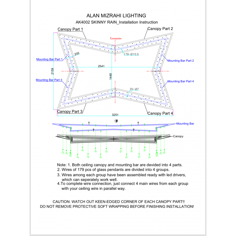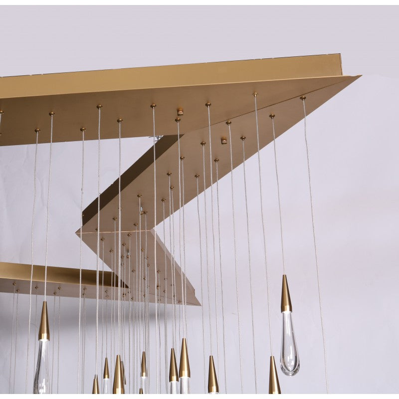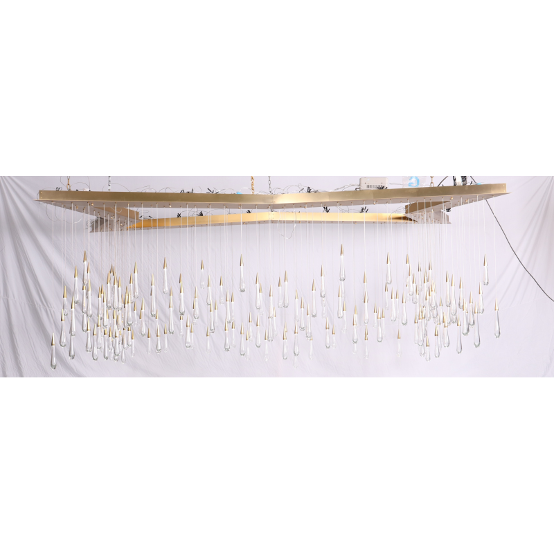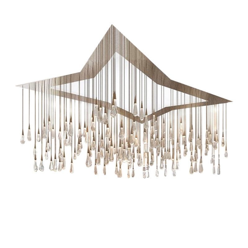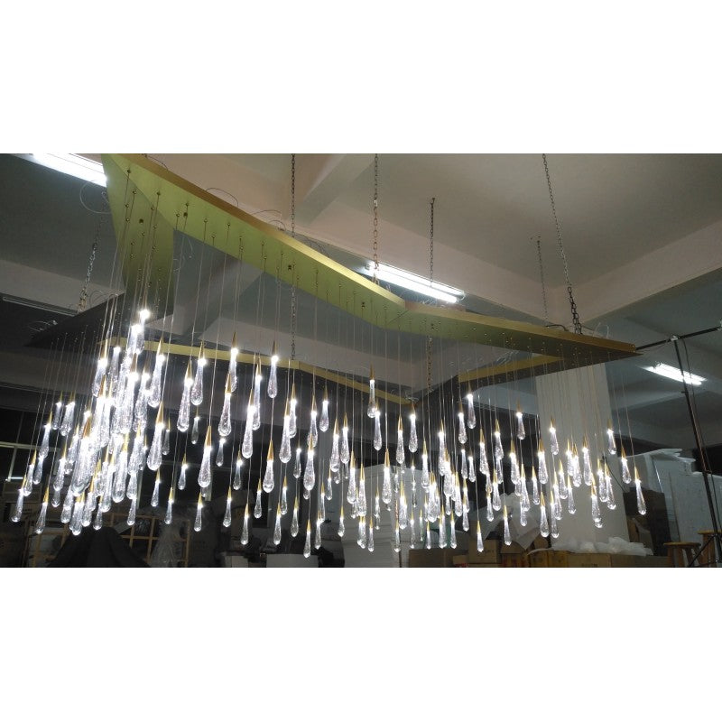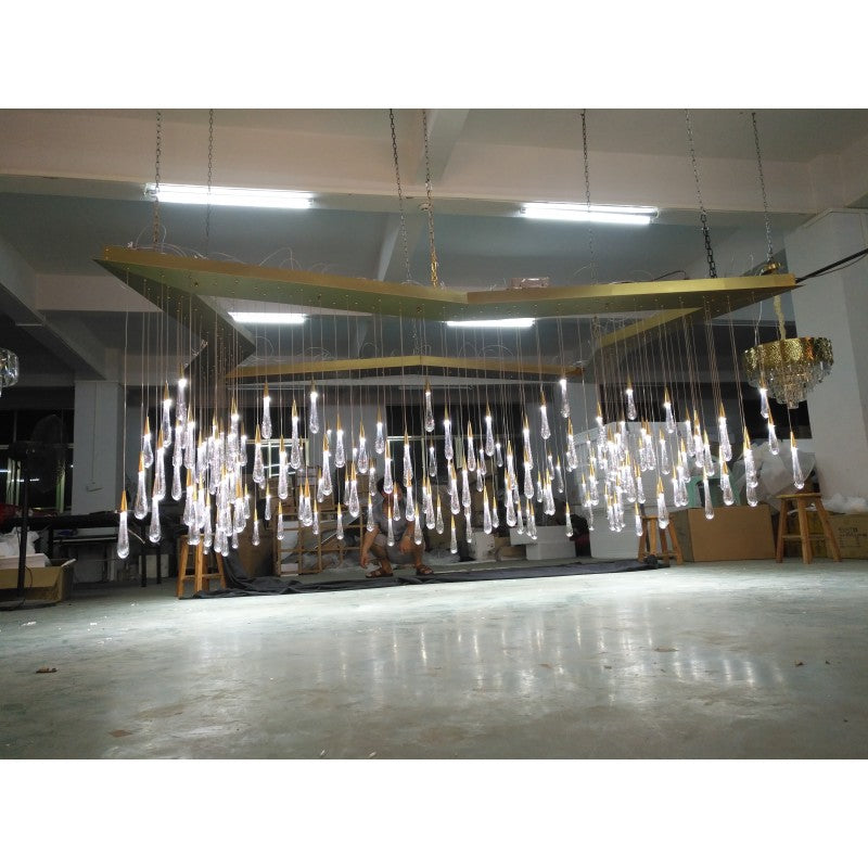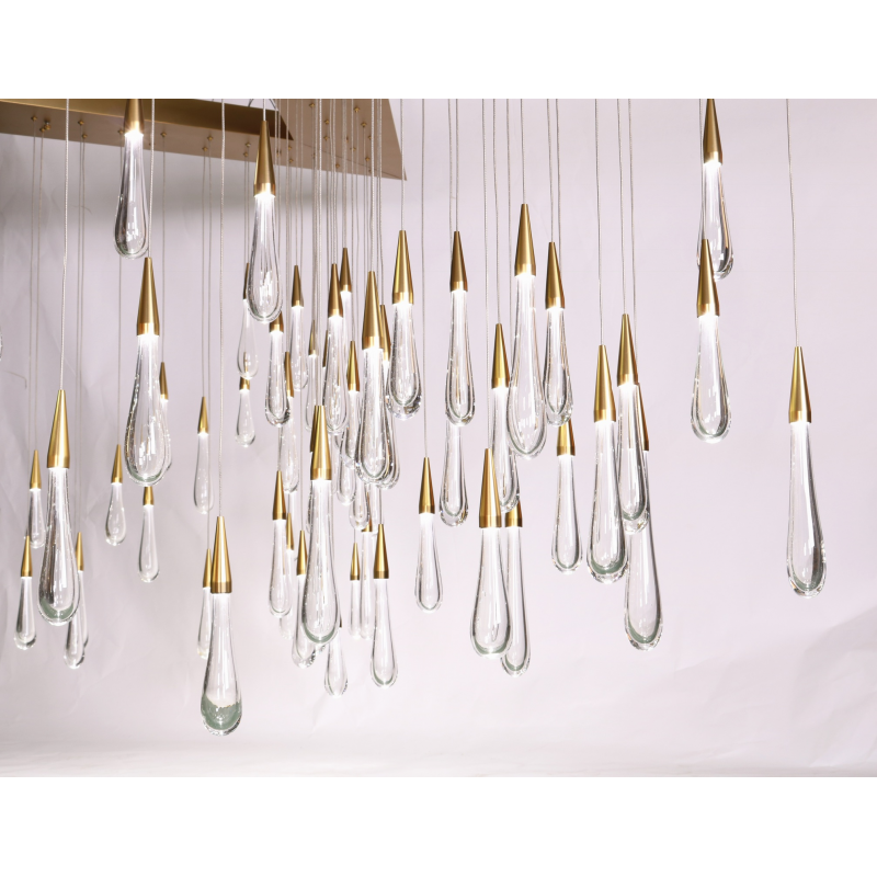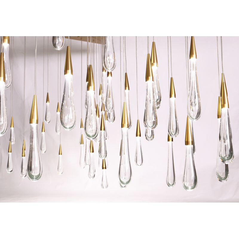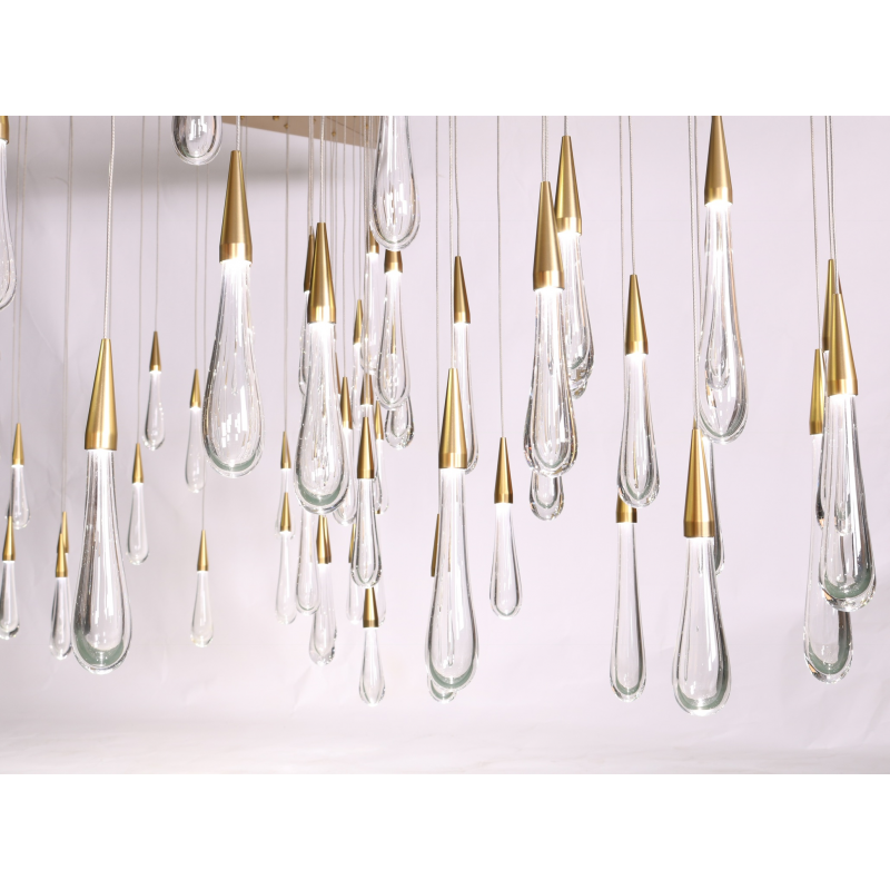 The light installation is a teardrop-shaped chandelier with deliciously unique lights that celebrate the fascinating nature of raindrops, where no drop is the same as the next. Each drop is hand-blown by artisans and intricately engineered to house the lighting strategy for the chandelier. When you see a light sculpture designed to increase the visual appeal of a room and define its luminous character, you stop on your way to admire it. It’s the case of the Raindrop chandelier known as “The Pour”, a modern light sculpture meant to illuminate and beautify its chosen location to create an architectural relationship with space. The drop itself is constructed of two parts: the brass screw cap, which houses the light, and the hand-blown crystal reflecting the light to create puddles on the floor below. To replicate the nature of raindrops, no two drops are blown identical. The name “The Pour” derives from the distinctive shape that the chandelier forms: an exaggeration of the dramatic motion of water pouring out of a carafe. Designed by forming a grid mimicking how puddles ripple outward in concentric circles, each teardrop is hung to brass pipes of varying lengths. Placed strategically on the grid, the teardrops lock into the mirrored base that fits seamlessly between the two existing columns. The mirrored base reflects the teardrops endlessly into the sky above and when lit. The chandelier echoes rain frozen in time with ephemeral puddles overlaid on the floor below.
